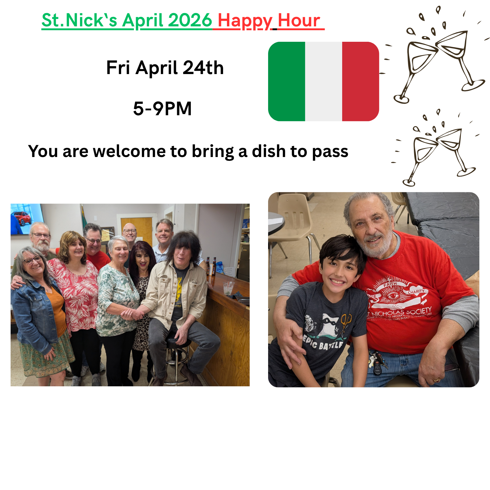 | Details: | Please join us for our April 2026 Happy Hour. You are welcome to bring a Dish to Pass |